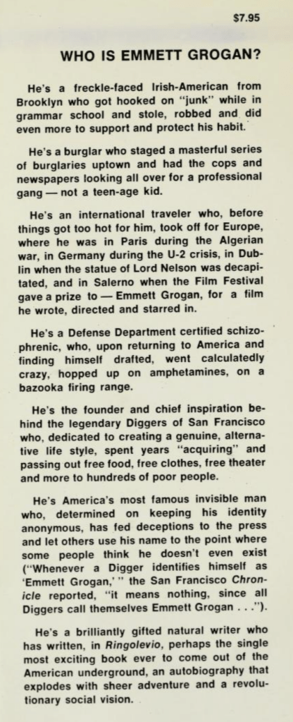 A few quick introductory words: Emmett Grogan has always been acknowledged by other Diggers as a prime mover in their effort, whose ‘membership’ was intended to be anonymous, open and leaderless. Still, Grogan’s name got out there in the press, and he became something of a notorious, talismanic figure in the exploding ‘60s cultural underground.
