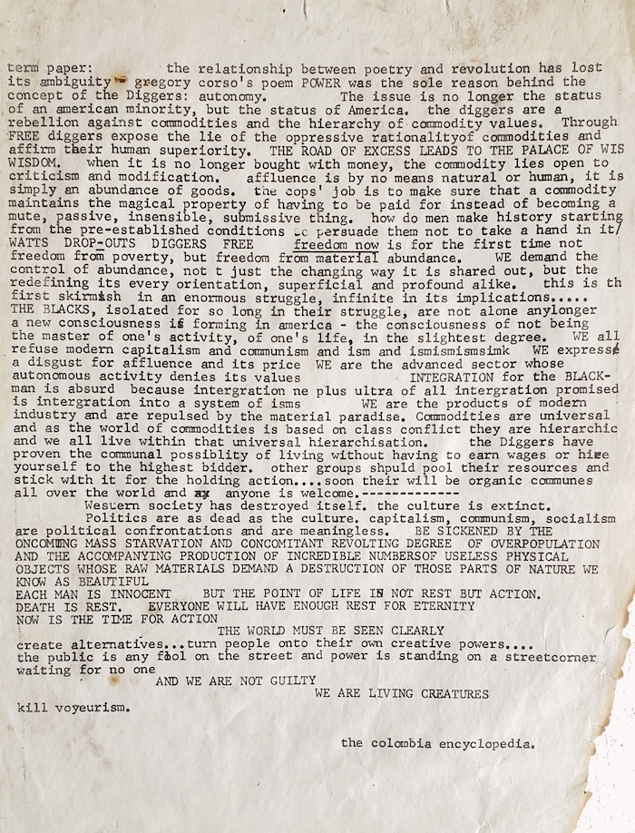 1. Thanks Jay. It sure looks like the typewriter print from Emmetts portable. He was certainly ahead of the times. And thanks to Eric Noble for preserving the documents of our era. You both have helped me to cherish the importance of the Diggers.