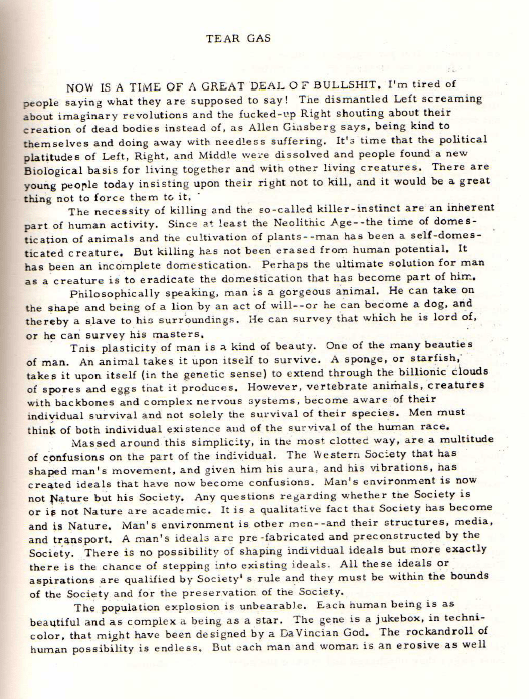 Here is “Tear Gas” by Michael McClure, via the Floating Bear archive: