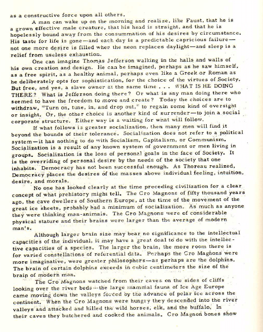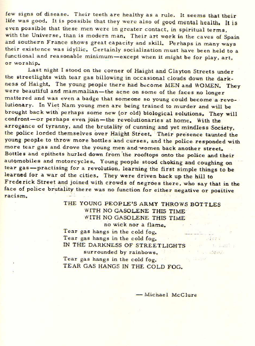 “‘Tear Gas’ by Michael McClure in Number 37 [March-July 1969] came my way in a kind of interesting way. There was an issue of The Realist, Paul Krassner’s magazine out of New York, that was devoted completely to the Diggers [No. 81/August 1968], and distributed free in San Francisco. And then there was a lot of leftover material that didn’t get into it, most of it unsigned. This leftover stuff was sent to my house in San Francisco by Emmett Grogan, so that Ron Thelin could get hold of it. Ron was one of the editors of the Oracle, but the Oracle had folded by then, and Ron wasn’t doing anything with the manuscript, so he left it with me. I found the piece by Michael, and stuck it in the last Bear…