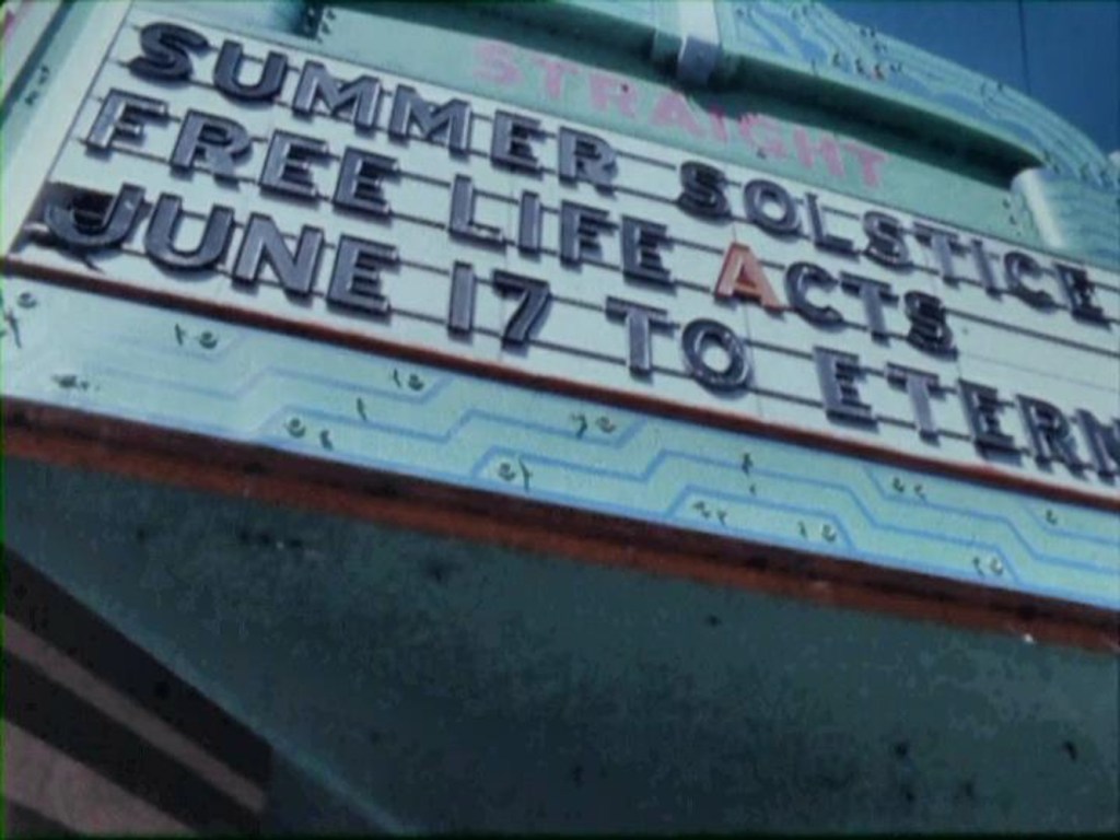 There were so many events! I can talk about some of the things that I think happened at The End of the War, but they may have been part of another event, I’m just not sure. It was definitely in the Straight Theater. Bruce Conner was running for mayor at that time and he was there, giving his mayoral ‘vote for me’ speech, and he listed all the things he was for: apple pie, lemon meringue pie, lots of very American foods and pies and things like that. It was very funny. I think that’s the event where Peter put together loops of disaster tapes, natural disaster tapes. Volcanoes erupting, hurricanes… We made black-and-white film loops of them and showed them on the screen.