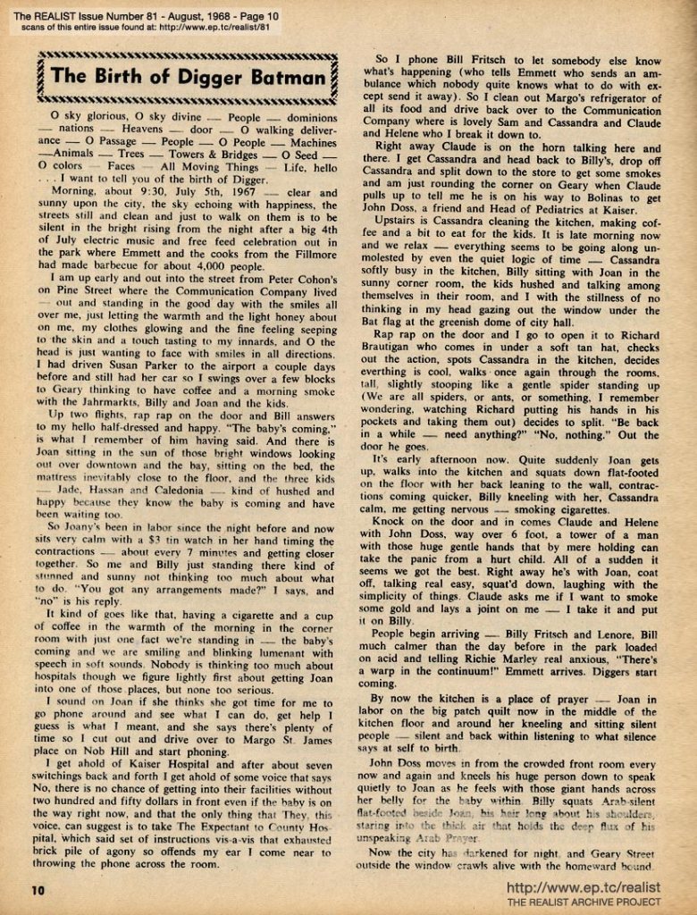 This is the tenth interview in my series of Diggers’ oral histories; the others are accessible here. For more detailed information on the Diggers, consult Eric Noble’s vast archive at diggers.org