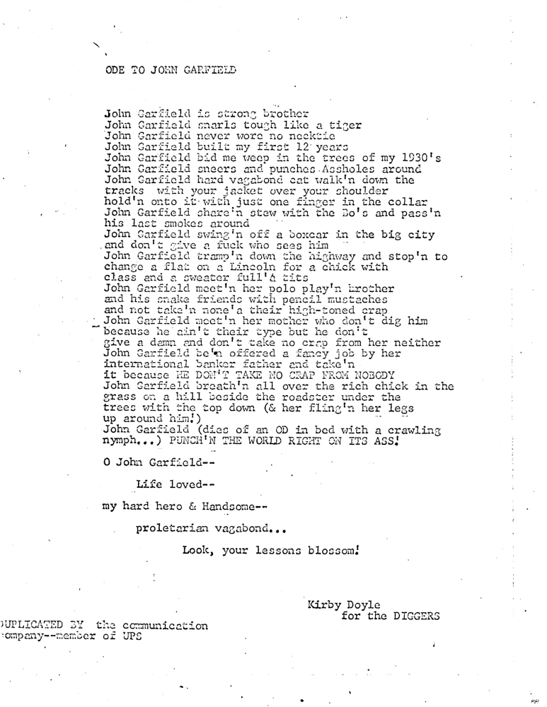 They posted this sign at the Mime Troupe. It was a manifesto that said Fuck everything, including everything that you might not want to fuck, like ‘Fuck the Black Panthers, fuck the Mime Troupe’… It was signed ‘the Diggers,’ but we knew who it was.