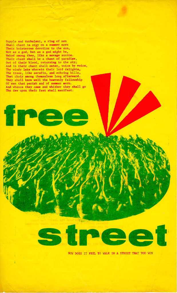 Right. There’s a quality of incantation in the language. And what the Digger language would do would be to break up sentences and re-arrange words in a manner that was sort of like Beat poetry but also psychedelic, so it was like: “Take a cop to dinner. Cop a take.” And so he would take words like that and re-arrange them and create a different meaning of it. What was that? Take a cop to dinner. It was about bribery and corruption. Copping a take. Suddenly reversing it would make the language hip and streetwise. So street language had this almost coded or incantatory quality to it. They were able to write it down, on one of those broadsides, so that, passed out, it would really have an effect. It would create this thing where people were all communicating on the same level.
